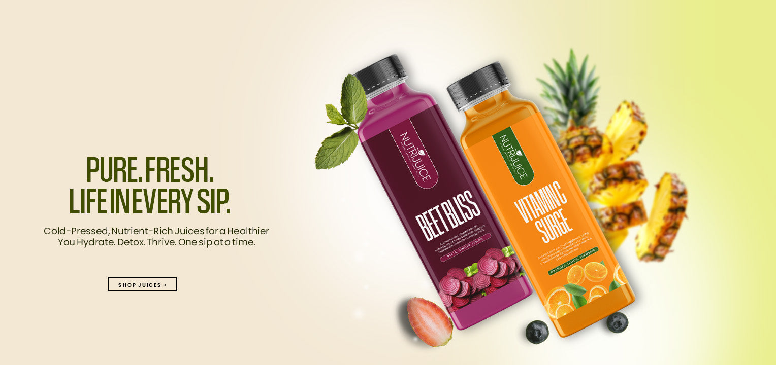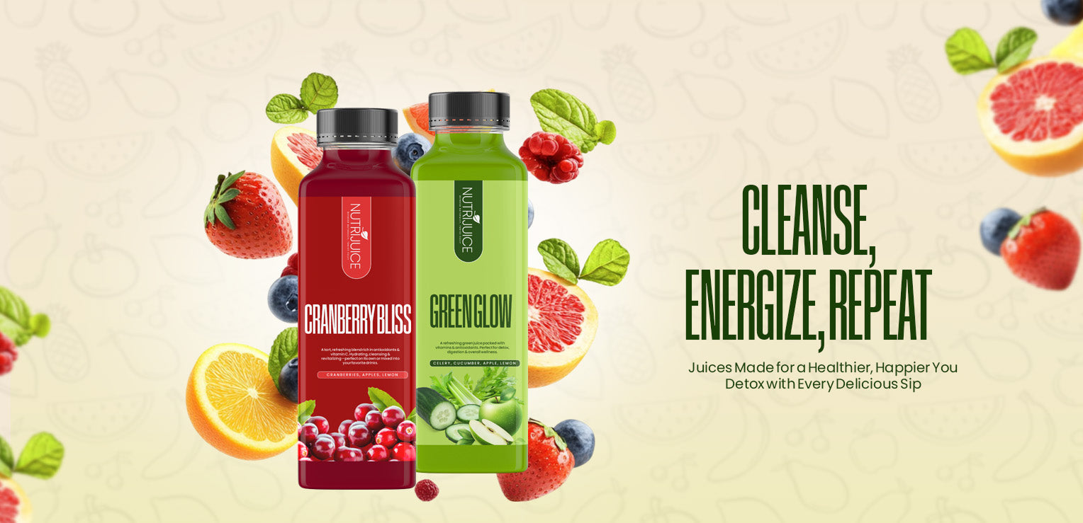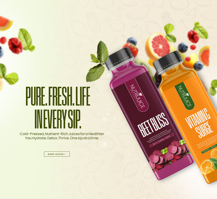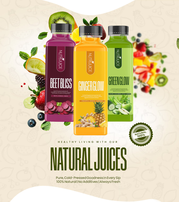 Experience the Power of 100% Natural Cold Pressed Juices! Packed with essential vitamins and nutrients, our juices are free from additives, preservatives, and artificial flavors. Just pure, wholesome goodness straight from nature to fuel your healthy lifestyle! "